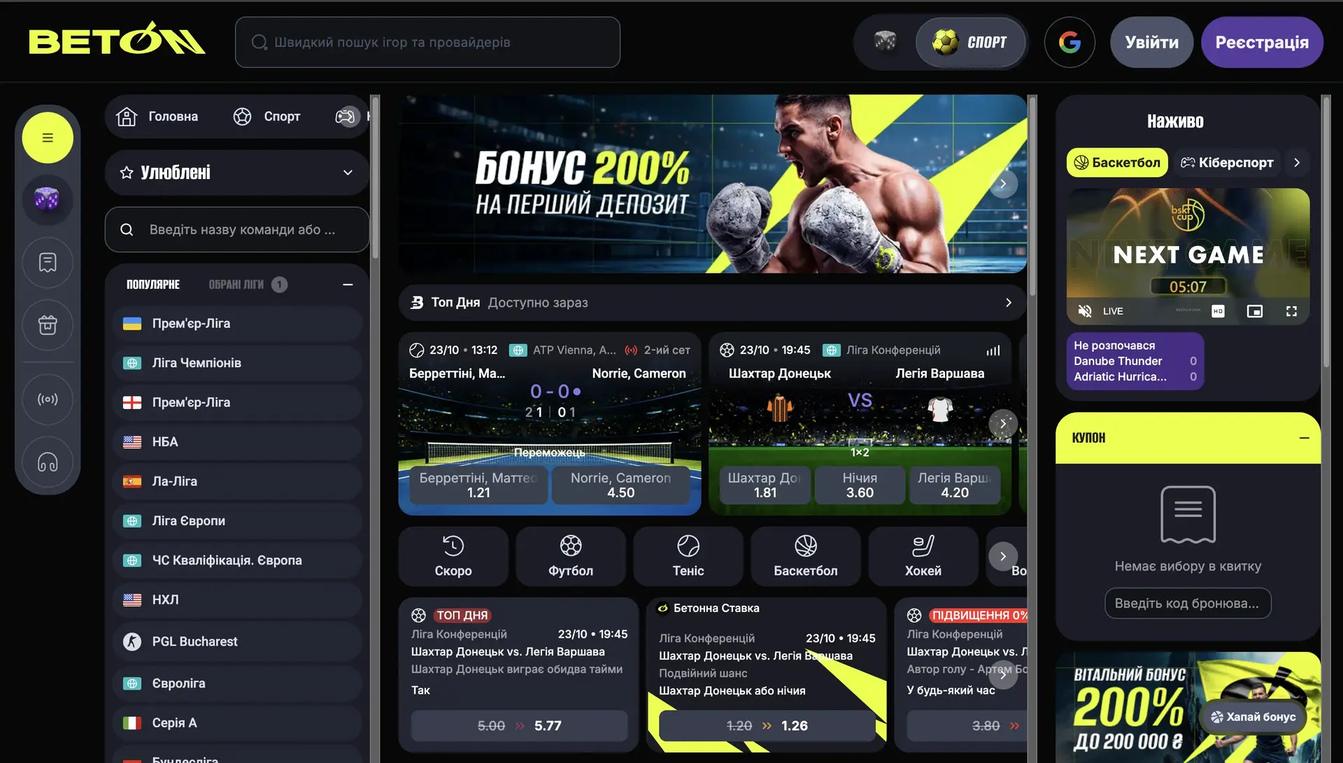 Офіційний сайт БК BETON створено так, аби ти зміг швидко орієнтуватися в розмаїтті ставок, ігор і подій. Інтерфейс максимально зрозумілий, розділи структуровано логічно: спортивні події, live-ставки, кіберспорт, казино, бонуси, акції тощо. Кожен розділ доступний буквально в один клік. Є можливість перемикатися між казино та букмекерською лінією, що робить платформу універсальним рішенням для будь-якого гравця. Особливо зручно, що є змога фільтрувати події за видами спорту, часом початку або навіть рівнем турніру.